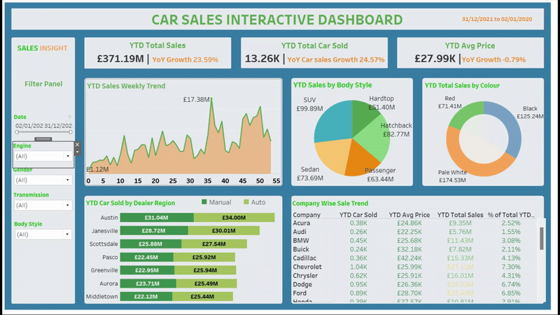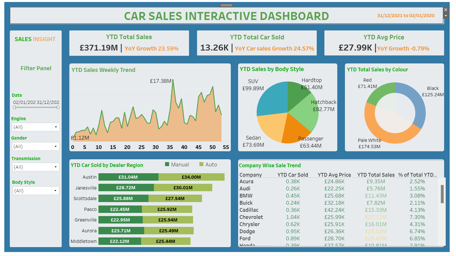 This is Tableau project analyzes car sales data. In order to help the stakeholder make data-driven decisions, the project will analyze and extract real time insights to address important questions, monitor progress and identify trends opportunities for growth.