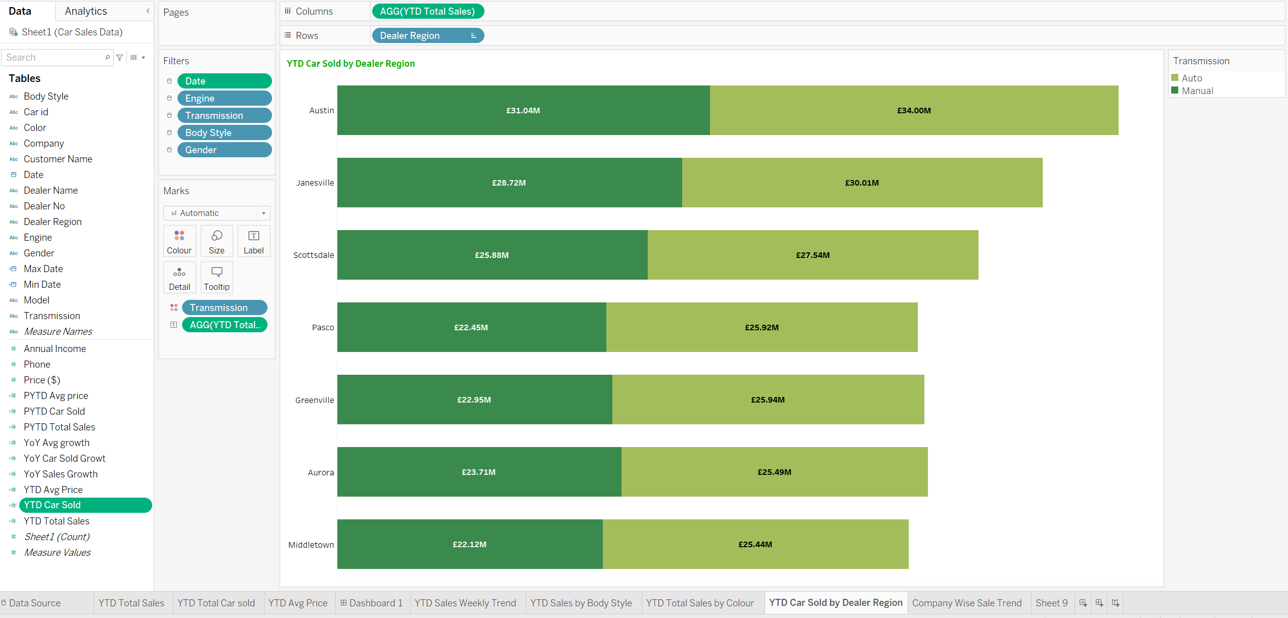 This is Tableau project analyzes car sales data. In order to help the stakeholder make data-driven decisions, the project will analyze and extract real time insights to address important questions, monitor progress and identify trends opportunities for growth.